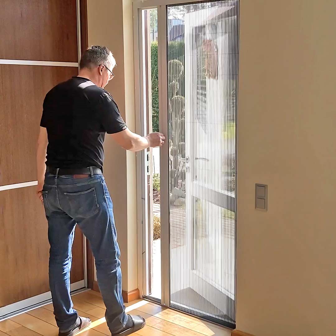 Pleated insect screen doors are especially suitable for both small and wide openings, such as terraces and balconies. The sliding construction ensures convenient opening and closing while taking up minimal space when the insect screen is not in use. The sliding direction of the foldable insect screen door – to the left or right – can be adjusted according to your preference during installation.
